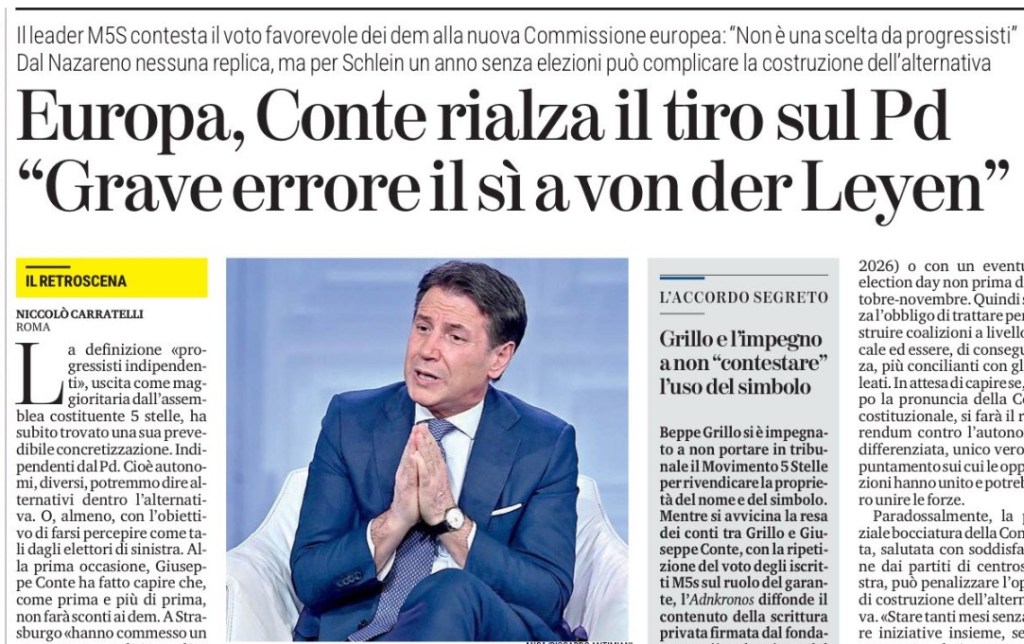 La definizione «progressisti indipendenti», uscita come maggioritaria dall’assemblea costituente 5 stelle, ha subito trovato una sua prevedibile concretizzazione. Indipendenti dal Pd. Cioè autonomi, diversi, potremmo dire alternativi dentro l’alternativa. O, almeno, con l’obiettivo di farsi percepire come tali dagli elettori di sinistra. Alla prima occasione, Giuseppe Conte ha fatto capire che, come prima e più di prima, non farà sconti ai dem. A Strasburgo «hanno commesso un grave errore politico», dice l’ex premier, riferendosi al voto sulla nuova Commissione europea. «Non è il fatto di trovarsi a votare con Meloni e FdI», spiega, il punto è che «la Commissione von der Leyen 2 non è progressismo» e «se vogliamo fare i progressisti dobbiamo farlo a tutto tondo». Insomma, cara Elly, io sono più progressista di te. Da via di Campo Marzio, in realtà, smentiscono che ci sia la volontà di mettersi in contrapposizione con il Pd: «Conte ha detto una cosa ovvia, il fatto di avere i dem come interlocutori non significa che non possiamo esprimere opinioni o critiche». Nello specifico, denunciare che il sì alla seconda Commissione von der Leyen «significa austerità, tagli alla sanità e al welfare – avverte il leader 5 stelle –. Parlano solo di transizione militare, non di transizione ecologica».