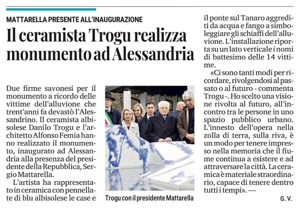 Due firme savonesi per il monumento a ricordo delle vittime dell’alluvione che trent’anni fa devastò l’Alessandrino. Il ceramista albissolese Danilo Trogu e l’architetto Alfonso Femia hanno realizzato il monumento, inaugurato ad Alessandria alla presenza del presidente della Repubblica, Sergio Mattarella.