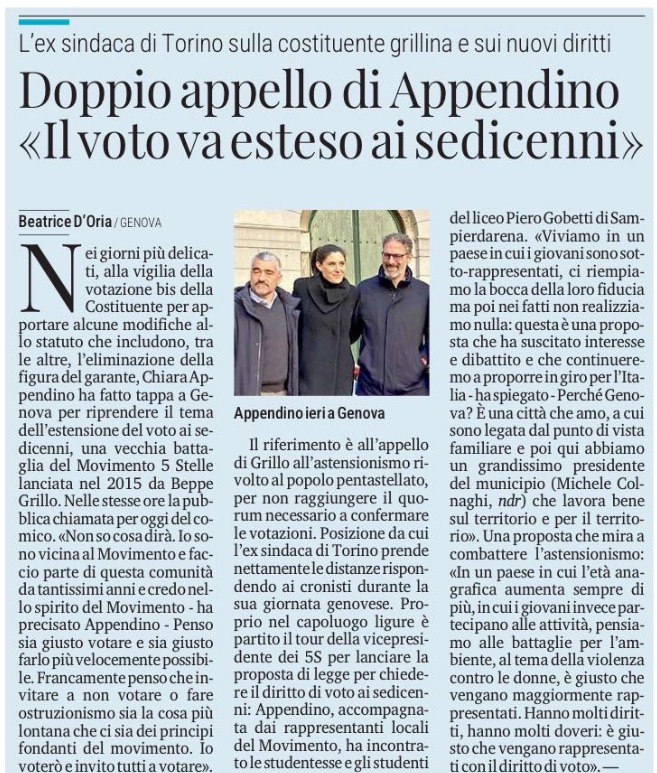 Il riferimento è all’appello di Grillo all’astensionismo rivolto al popolo pentastellato, per non raggiungere il quorum necessario a confermare le votazioni. Posizione da cui l’ex sindaca di Torino prende nettamente le distanze rispondendo ai cronisti durante la sua giornata genovese. Proprio nel capoluogo ligure è partito il tour della vicepresidente dei 5S per lanciare la proposta di legge per chiedere il diritto di voto ai sedicenni: Appendino, accompagnata dai rappresentanti locali del Movimento, ha incontrato le studentesse e gli studenti del liceo Piero Gobetti di Sampierdarena. «Viviamo in un paese in cui i giovani sono sotto-rappresentati, ci riempiamo la bocca della loro fiducia ma poi nei fatti non realizziamo nulla: questa è una proposta che ha suscitato interesse e dibattito e che continueremo a proporre in giro per l’Italia – ha spiegato – Perché Genova? È una città che amo, a cui sono legata dal punto di vista familiare e poi qui abbiamo un grandissimo presidente del municipio (Michele Colnaghi, ndr ) che lavora bene sul territorio e per il territorio». Una proposta che mira a combattere l’astensionismo: «In un paese in cui l’età anagrafica aumenta sempre di più, in cui i giovani invece partecipano alle attività, pensiamo alle battaglie per l’ambiente, al tema della violenza contro le donne, è giusto che vengano maggiormente rappresentati. Hanno molti diritti, hanno molti doveri: è giusto che vengano rappresentati con il diritto di voto».