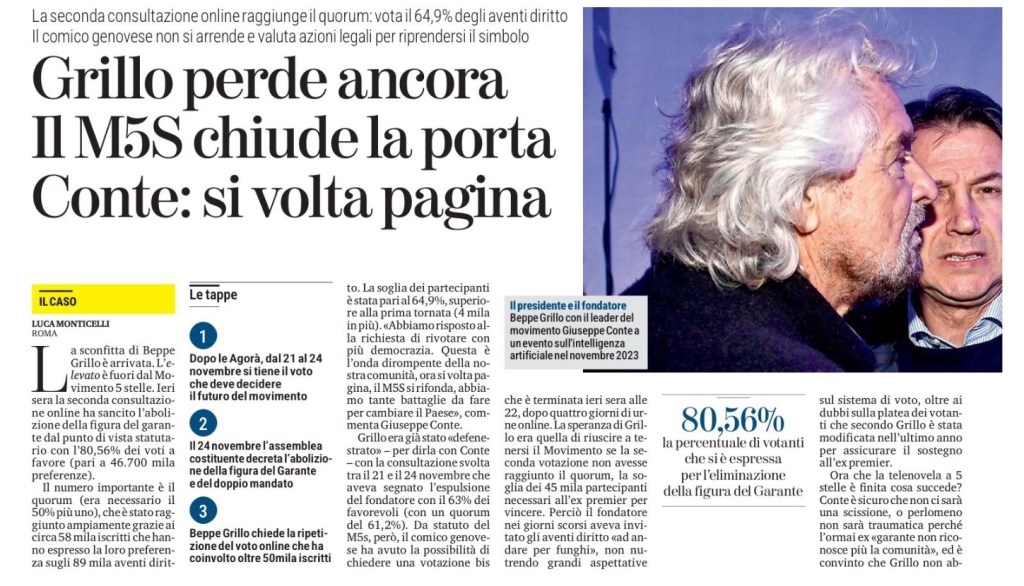 Grillo era già stato «defenestrato» – per dirla con Conte – con la consultazione svolta tra il 21 e il 24 novembre che aveva segnato l’espulsione del fondatore con il 63% dei favorevoli (con un quorum del 61,2%). Da statuto del M5s, però, il comico genovese ha avuto la possibilità di chiedere una votazione bis che è terminata ieri sera alle 22, dopo quattro giorni di urne online. La speranza di Grillo era quella di riuscire a tenersi il Movimento se la seconda votazione non avesse raggiunto il quorum, la soglia dei 45 mila partecipanti necessari all’ex premier per vincere. Perciò il fondatore nei giorni scorsi aveva invitato gli aventi diritto «ad andare per funghi», non nutrendo grandi aspettative sul sistema di voto, oltre ai dubbi sulla platea dei votanti che secondo Grillo è stata modificata nell’ultimo anno per assicurare il sostegno all’ex premier.
