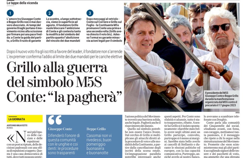 Le tappe della vicenda Giuseppe Conte ” Grillo alla guerra del simbolo M5S Conte: “la pagherà” Beppe Grillo