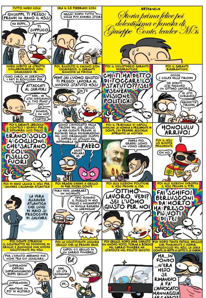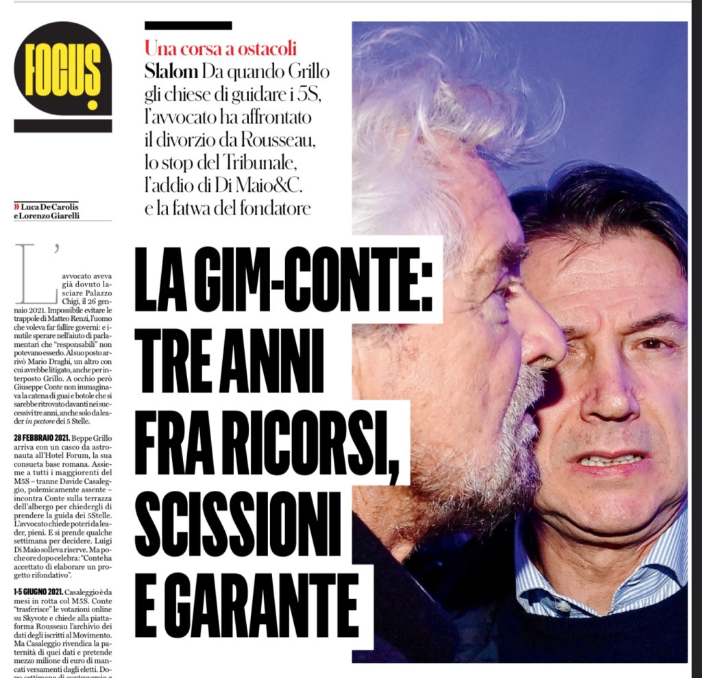 L’avvocato aveva già dovuto lasciare Palazzo Chigi, il 26 gennaio 2021. Impossibile evitare le trappole di Matteo Renzi, l’uomo che voleva far fallire governi: e inutile sperare nell’aiuto di parlamentari che “responsabili” non potevano esserlo. Al suo posto arrivò Mario Draghi, un altro con cui avrebbe litigato, anche per interposto Grillo. A occhio però Giuseppe Conte non immaginava la catena di guai e botole che si sarebbe ritrovato davanti nei successivi tre anni, anche solo da leader in pectore dei 5 Stelle.