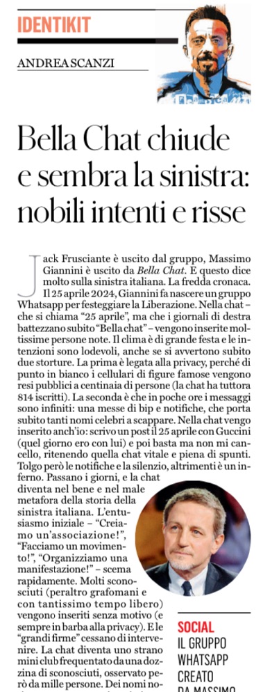 Jack Frusciante è uscito dal gruppo, Massimo Giannini è uscito da Bella Chat. E questo dice molto sulla sinistra italiana. La fredda cronaca. Il 25 aprile 2024, Giannini fa nascere un gruppo Whatsapp per festeggiare la Liberazione. Nella chat – che si chiama “25 aprile”, ma che i giornali di destra battezzano subito “Bella chat” – vengono inserite moltissime persone note. Il clima è di grande festa e le intenzioni sono lodevoli, anche se si avvertono subito due storture. La prima è legata alla privacy, perché di punto in bianco i cellulari di figure famose vengono resi pubblici a centinaia di persone (la chat ha tuttora 814 iscritti). La seconda è che in poche ore i messaggi sono infiniti: una messe di bip e notifiche, che porta subito tanti nomi celebri a scappare. Nella chat vengo inserito anch’io: scrivo un post il 25 aprile con Guccini (quel giorno ero con lui) e poi basta ma non mi cancello, ritenendo quella chat vitale e piena di spunti. Tolgo però le notifiche e la silenzio, altrimenti è un inferno. Passano i giorni, e la chat diventa nel bene e nel male metafora della storia della sinistra italiana. L’entusiasmo iniziale – “Creiamo un’associazione!”, “Facciamo un movimento!”, “Organizziamo una manifestazione!” – scema rapidamente. Molti sconosciuti (peraltro grafomani e con tantissimo tempo libero) vengono inseriti senza motivo (e sempre in barba alla privacy). E le “grandi firme” cessano di intervenire. La chat diventa uno strano mini club frequentato da una dozzina di sconosciuti, osservato però da mille persone. Dei nomi noti, proseguono a scriverci giusto Nadia Urbinati, Rula Jebreal, Emanuele Fiano e pochi altri.