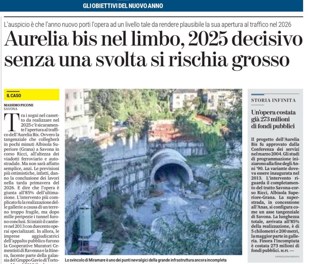 Tra i sogni nel cassetto da realizzare nel 2025 c’è sicuramente l’apertura al traffico dell’Aurelia Bis. Ovvero la tangenziale che collegherà in pochi minuti Albisola Superiore (Grana) a Savona in corso Ricci, all’altezza dei viadotti ferroviario e autostradale. Ma non sarà affatto semplice, anzi. Le previsioni più ottimistiche, infatti, danno la conclusione dei lavori nella tarda primavera del 2026. E dire che l’opera è giunta all’85% dell’ultimazione. L’intervento più complicato fu la realizzazione delle gallerie a causa di un terreno troppo fragile, ma dopo mille peripezie i tunnel furono conclusi. Si iniziò il cantiere nel 2013 con duecento operai specializzati. In allora, le imprese aggiudicatrici dell’appalto pubblico furono la Cooperative Muratori Cementisti di Ravenna e la Itinera, facente parte della galassia del Gruppo Gavio di Tortona. Ma nel 2018 il colosso romagnolo finì clamorosamente in concordato preventivo per evitare il fallimento e la messa in liquidazione davanti al giudice civile, dopo oltre un secolo di storia e di successi coronati da grandi opere realizzate in tutta Italia. Solo due anni prima, l’allora presidente di Anas (concessionaria della tangenziale, ndr.) Gianni Vittorio Armani, al termine di un sopralluogo nei cantieri, confermava che l’Aurelia Bis sarebbe stata completata proprio entro il 2018. Ma proprio l’anno seguente arrivò il crollo della Cmc che decretò lo stop all’intervento con la Itinera che, dopo alcuni contatti con altre imprese del settore viario, fece un passo indietro e si ritirò dall’avventura. Per non farsi mancare nulla, mentre erbacce e rovi crescevano rigogliosi nei cantieri delle Albisole e di Savona, nell’aprile 2020 la Corte dei Conti aprì un fascicolo, ipotizzando il danno erariale considerando che si tratta comunque di un’opera pubblica. Le indagini della Guardia di Finanza di Savona puntarono all’appalto fallito da 170 milioni di euro. Quella montagna di soldi furono finanziati dal Cipe (Comitato Interministeriale per la Programmazione Economica), con un impegno di spesa di 270 milioni di euro. Secondo quanto appreso Anas, stazione appaltante, non avrebbe vigilato sui lavori compiuti dall’Ati incaricata dei lavori, ovvero Ici acronimo della Italiana Costruzioni Infrastrutture di Roma e le imprese collegate ossia Cesi, Igeas e Rti Techint (subentranti a Cmc e Itinera), che si sono interrotti più volte. Inoltre, il tratto di Aurelia Bis è risultato non idoneo a collegare direttamente il casello con l’hub portuale di Savona. Ici è attiva nella realizzazione di grandi progetti di opere civili e residenziali e, indirettamente, di esecuzione di strade e superstrade, metropolitane, ponti e ferrovie tramite la controllata Italiana Costruzioni Infrastrutture. Quest’ultima si aggiudicò l’appalto del lotto di completamento dell’Aurelia Bis. Ma nell’estate scorsa è arrivata la crisi finanziaria anche per Ici. Gli operai rimasti al lavoro, una trentina, senza stipendio per due mesi, con la Cassa Edile non versata dal marzo scorso andarono in sciopero, che finì con l’arrivo dei bonifici attesi: «Siamo a un bivio – dice Andrea Tafaria, segretario Filca Cisl Liguria -, aspettiamo l’incontro in prefettura dopo il 15 gennaio, che sarà decisivo. Se non ci saranno sufficienti garanzie chiederemo che venga sostituita la società costruttrice mantenendo la forza lavoro». —