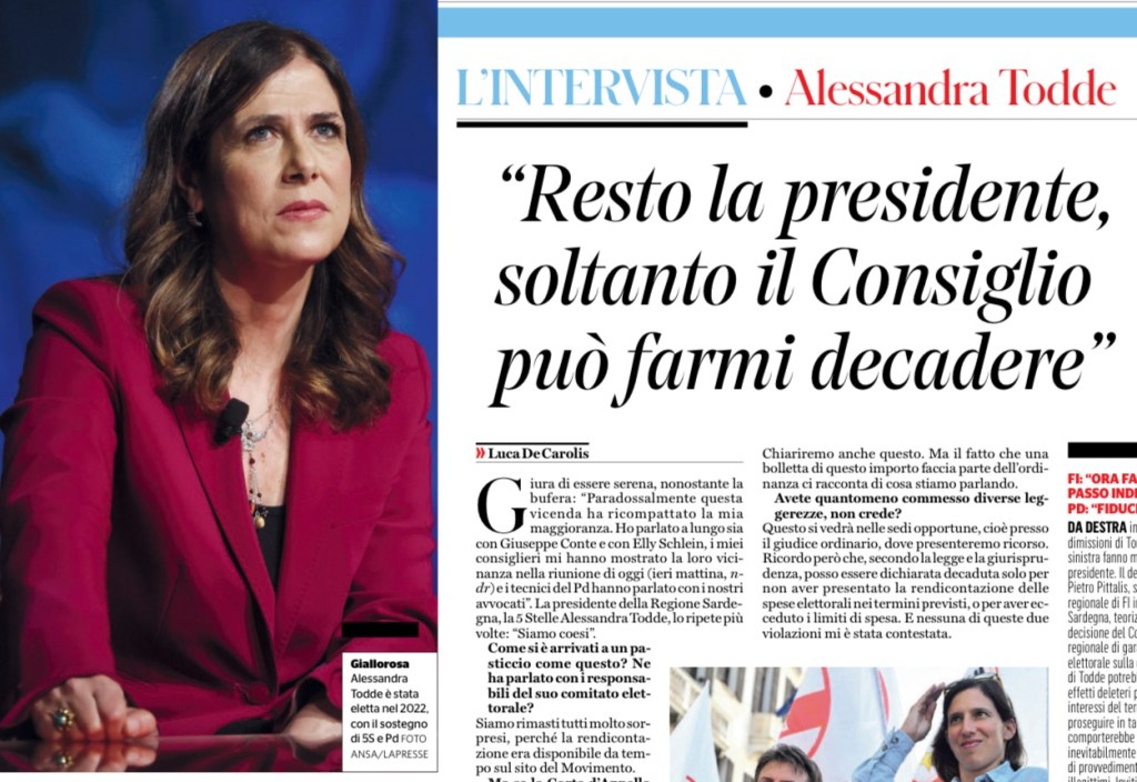 Giura di essere serena, nonostante la bufera: “Paradossalmente questa vicenda ha ricompattato la mia maggioranza. Ho parlato a lungo sia con Giuseppe Conte e con Elly Schlein, i miei consiglieri mi hanno mostrato la loro vicinanza nella riunione di oggi (ieri mattina, ndr) e i tecnici del Pd hanno parlato con i nostri avvocati”. La presidente della Regione Sardegna, la 5 Stelle Alessandra Todde, lo ripete più volte: “Siamo coesi”.