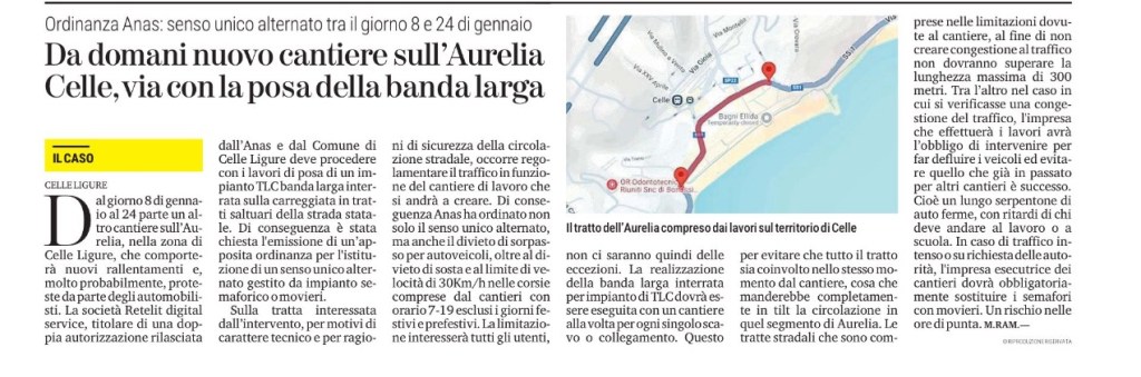 Dal giorno 8 di gennaio al 24 parte un altro cantiere sull’Aurelia, nella zona di Celle Ligure, che comporterà nuovi rallentamenti e, molto probabilmente, proteste da parte degli automobilisti. La società Retelit digital service, titolare di una doppia autorizzazione rilasciata dall’Anas e dal Comune di Celle Ligure deve procedere con i lavori di posa di un impianto TLC banda larga interrata sulla carreggiata in tratti saltuari della strada statale. Di conseguenza è stata chiesta l’emissione di un’apposita ordinanza per l’istituzione di un senso unico alternato gestito da impianto semaforico o movieri.