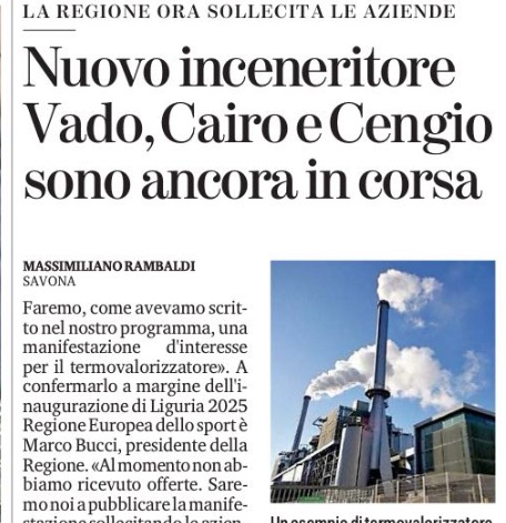 Faremo, come avevamo scritto nel nostro programma, una manifestazione d’interesse per il termovalorizzatore». A confermarlo a margine dell’inaugurazione di Liguria 2025 Regione Europea dello sport è Marco Bucci, presidente della Regione. «Al momento non abbiamo ricevuto offerte. Saremo noi a pubblicare la manifestazione sollecitando le aziende pronte. Vogliamo un impianto energetico che riesca a generare energia. Non lo definiamo però in partenza proprio come “termovalorizzatore” ma vogliamo ci sia la partecipazione delle aziende della tecnologia per dare a noi quello che è meglio per chiudere il ciclo dei rifiuti e quello che sarà meglio per chi ci vivrà attorno. Vogliamo che possano avere dei vantaggi come accade ad esempio a Torino dove possono usufruire del teleriscaldamento e ovviamente una riduzione della Tari».