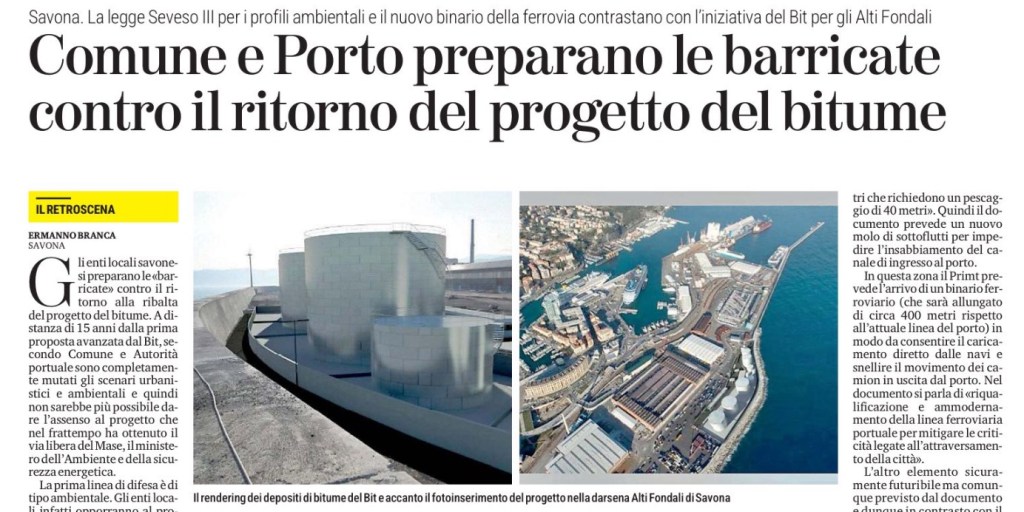 Gli enti locali savonesi preparano le «barricate» contro il ritorno alla ribalta del progetto del bitume. A distanza di 15 anni dalla prima proposta avanzata dal Bit, secondo Comune e Autorità portuale sono completamente mutati gli scenari urbanistici e ambientali e quindi non sarebbe più possibile dare l’assenso al progetto che nel frattempo ha ottenuto il via libera del Mase, il ministero dell’Ambiente e della sicurezza energetica.