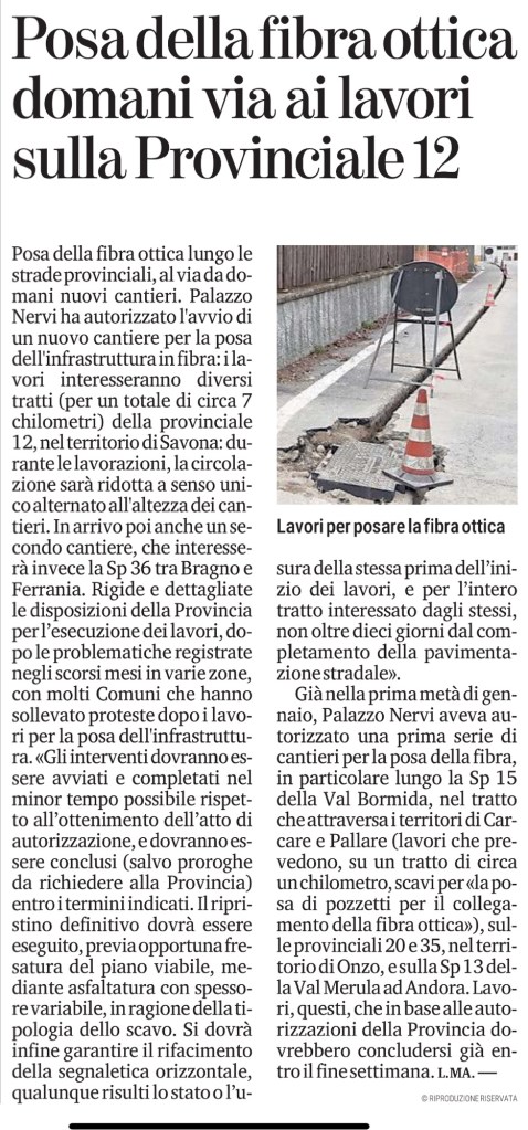 Posa della fibra ottica lungo le strade provinciali, al via da domani nuovi cantieri. Palazzo Nervi ha autorizzato l’avvio di un nuovo cantiere per la posa dell’infrastruttura in fibra: i lavori interesseranno diversi tratti (per un totale di circa 7 chilometri) della provinciale 12, nel territorio di Savona; durante le lavorazioni, la circolazione sarà ridotta a senso unico alternato all’altezza dei cantieri. In arrivo poi anche un secondo cantiere, che interesserà invece la Sp 36 tra Bragno e Ferrania. Rigide e dettagliate le disposizioni della Provincia per l’esecuzione dei lavori, dopo le problematiche registrate negli scorsi mesi in varie zone, con molti Comuni che hanno sollevato proteste dopo i lavori per la posa dell’infrastruttura.