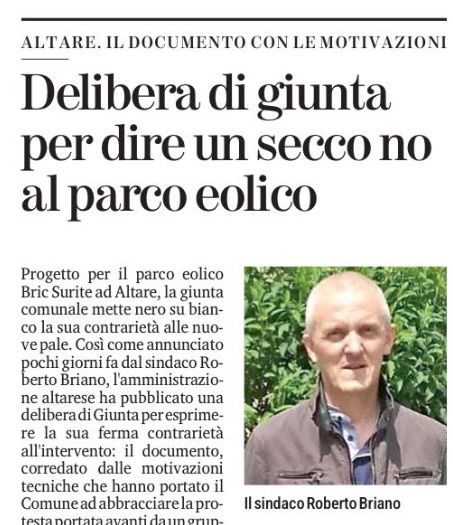Progetto per il parco eolico Bric Surite ad Altare, la giunta comunale mette nero su bianco la sua contrarietà alle nuove pale. Così come annunciato pochi giorni fa dal sindaco Roberto Briano, l’amministrazione altarese ha pubblicato una delibera di Giunta per esprimere la sua ferma contrarietà all’intervento: il documento, corredato dalle motivazioni tecniche che hanno portato il Comune ad abbracciare la protesta portata avanti da un gruppo di cittadini e dai gruppi di minoranza, è già disponibile all’albo pretorio.