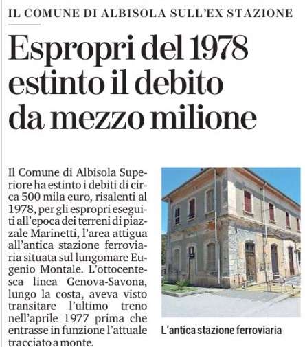 Il Comune di Albisola Superiore ha estinto i debiti di circa 500 mila euro, risalenti al 1978, per gli espropri eseguiti all’epoca dei terreni di piazzale Marinetti, l’area attigua all’antica stazione ferroviaria situata sul lungomare Eugenio Montale. L’ottocentesca linea Genova-Savona, lungo la costa, aveva visto transitare l’ultimo treno nell’aprile 1977 prima che entrasse in funzione l’attuale tracciato a monte.