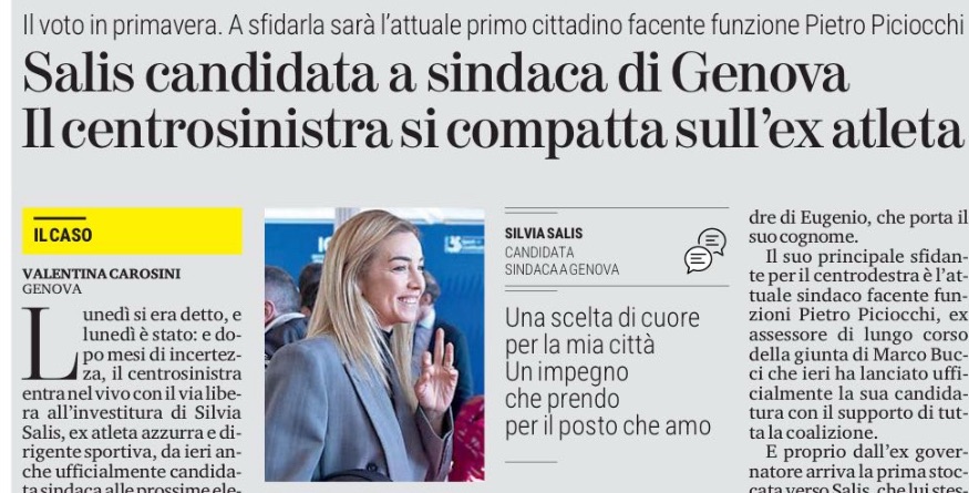 Lunedì si era detto, e lunedì è stato: e dopo mesi di incertezza, il centrosinistra entra nel vivo con il via libera all’investitura di Silvia Salis, ex atleta azzurra e dirigente sportiva, da ieri anche ufficialmente candidata sindaca alle prossime elezioni comunali di primavera a Genova.