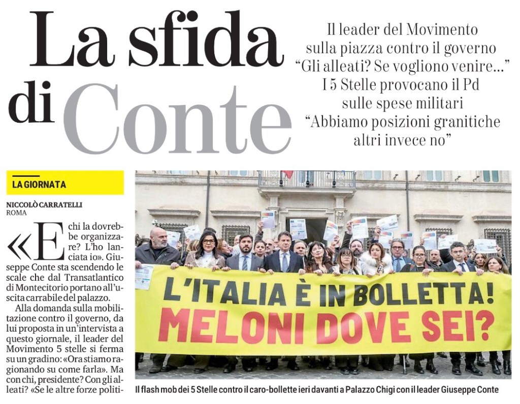 Alla domanda sulla mobilitazione contro il governo, da lui proposta in un’intervista a questo giornale, il leader del Movimento 5 Stelle si ferma su un gradino: «Ora stiamo ragionando su come farla». Ma con chi, presidente? Con gli alleati? «Se le altre forze politiche condivideranno i contenuti e vorranno partecipare…». Insomma, ci siamo capiti: la piazza è mia e la gestisco io. Del resto, lo ha già dimostrato un’oretta prima davanti a Palazzo Chigi, con un flash mob inscenato per lamentarsi con Giorgia Meloni del caro-bollette e denunciare l’inerzia del governo rispetto all’aumento dei costi dell’energia. L’ex premier e i suoi si sono presentati con uno striscione giallo con la scritta in blu: “L’Italia è in bolletta. Meloni dove sei?”. Per far vedere, insomma, chi è il vero oppositore del governo.