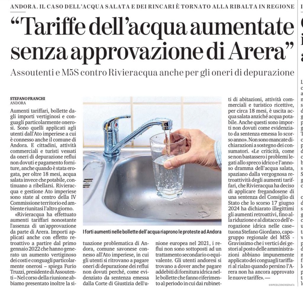 «Rivieracqua ha effettuato aumenti tariffari nonostante l’assenza di un’approvazione da parte di Arera. Importi applicati anche con effetto retroattivo a partire dal primo gennaio 2022 che hanno generato un aumento vertiginoso dei costi e conguagli particolarmente onerosi – spiega Furio Truzzi, presidente di Assoutenti – Nel corso della riunione abbiamo presentato inoltre la situazione problematica di Andora, comune savonese connesso all’Ato imperiese, in cui gli utenti si ritrovano a pagare oneri di depurazione dei reflui non dovuti perché, come evidenziato da sentenza emessa dalla Corte di Giustizia dell’unione europea nel 2021, i reflui non sono sottoposti ad un trattamento secondario o equivalente. Gli utenti andoresi si trovano a dover anche pagare addebiti di fornitura idrica nelle bollette che fanno riferimento al periodo in cui dai rubinetti di abitazioni, attività commerciali e turistico ricettive, per circa 18 mesi, è uscita acqua salata anziché acqua potabile. Anche questi sono importi non dovuti come evidenziato da sentenza emessa lo scorso anno». Non sono mancate dichiarazioni a sostegno dei consumatori. «Le criticità, come se non bastassero i problemi legati allo spreco idrico e l’annoso dramma dell’acqua salata, spaziano dalla vergognosa retroattività degli aumenti tariffari, che Rivieracqua ha deciso di applicare fregandosene di una sentenza del Consiglio di Stato che lo scorso 17 giugno 2024 ha dichiarato illegittimi gli aumenti retroattivi, fino alla riduzione e al distacco dell’erogazione idrica nelle case– tuona Stefano Giordano, capogruppo regionale del M5S – Gravissimo che i vertici dei gestori al posto delle amministrazioni abbiano impunemente applicato dei conguagli tariffari al rialzo quando persino l’Arera non ha ancora approvato le nuove tariffe».