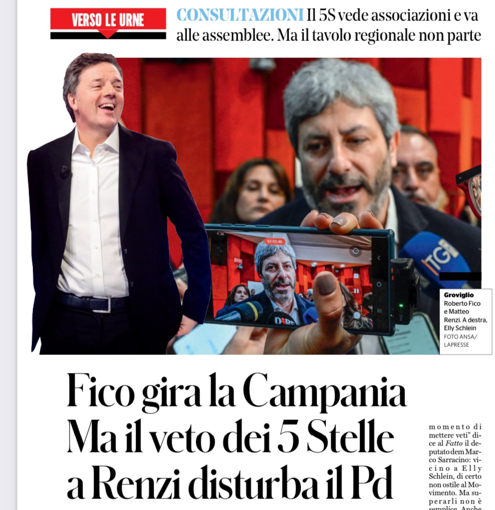 Il veterano a 5Stelle è quasi pronto, il fu rottamatore anche. Ma far incontrare Roberto Fico e Matteo Renzi, o almeno farli coesistere senza contraccolpi apparenti è una bella rogna, innanzitutto per il Pd, che già lo dice al Movimento: “Niente veti, non ce li possiamo permettere”. Perché il tempo corre velocissimo, nella partita per la Regione Campania dove il presunto centrosinistra si gioca parecchio del suo futuro. Nel nome di Fico, la prima carta che non si è ancora tramutata in candidato. Con la vecchia regola a 5Stelle dei due mandati ancora in vigente, non potrebbe neanche esserlo. Ma l’ex presidente della Camera Roberto Fico, quello che nel 2005 stava con un cartello davanti a una fontana del centro di Napoli per ammonire che “quest’acqua deve rimanere pubblica”, si prepara alla corsa per la Campania.