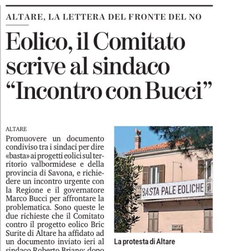 Promuovere un documento condiviso tra i sindaci per dire «basta» ai progetti eolici sul territorio valbormidese e della provincia di Savona, e richiedere un incontro urgente con la Regione e il governatore Marco Bucci per affrontare la problematica. Sono queste le due richieste che il Comitato contro il progetto eolico Bric Surite di Altare ha affidato ad un documento inviato ieri al sindaco Roberto Briano: dopo l’assemblea pubblica di venerdì scorso, che ha visto la partecipazione di numerosi amministratori valbormidesi e regionali, oltre che di esponenti di altre associazioni e comitati della zona, il Comitato altarese ha provveduto a mettere nero su bianco le sue richieste, sollecitando l’amministrazione a farsi portavoce anche nel resto della provincia.