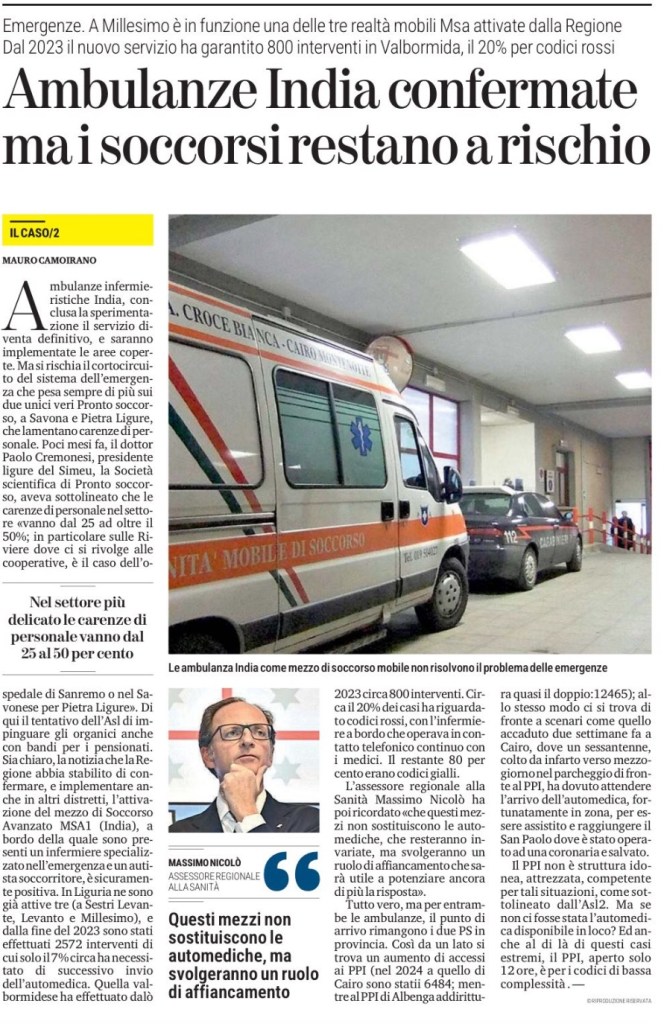Ambulanze infermieristiche India, conclusa la sperimentazione il servizio diventa definitivo, e saranno implementate le aree coperte. Ma si rischia il cortocircuito del sistema dell’emergenza che pesa sempre di più sui due unici veri Pronto soccorso, a Savona e Pietra Ligure, che lamentano carenze di personale.