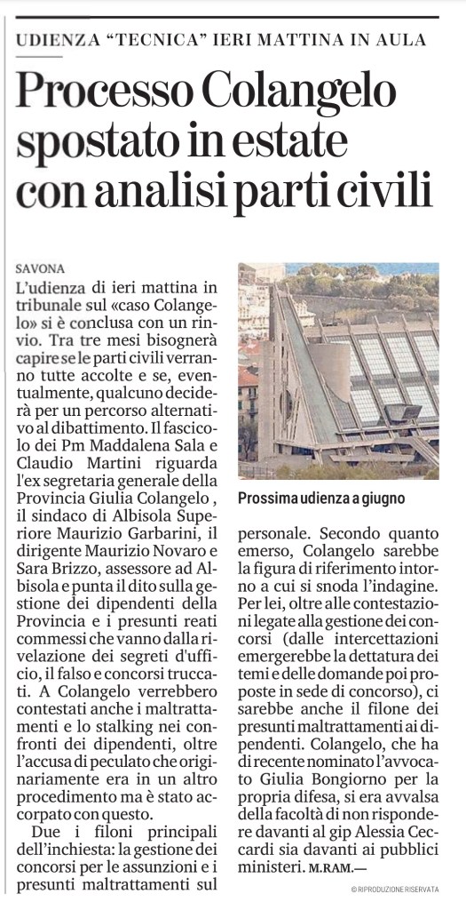 L’udienza di ieri mattina in tribunale sul «caso Colangelo» si è conclusa con un rinvio. Tra tre mesi bisognerà capire se le parti civili verranno tutte accolte e se, eventualmente, qualcuno deciderà per un percorso alternativo al dibattimento. Il fascicolo dei Pm Maddalena Sala e Claudio Martini riguarda l’ex segretaria generale della Provincia Giulia Colangelo, il sindaco di Albisola Superiore Maurizio Garbarini, il dirigente Maurizio Novaro e Sara Brizzo, assessore ad Albisola e punta il dito sulla gestione dei dipendenti della Provincia e i presunti reati commessi che vanno dalla rivelazione dei segreti d’ufficio, il falso e concorsi truccati. A Colangelo verrebbero contestati anche i maltrattamenti e lo stalking nei confronti dei dipendenti, oltre l’accusa di peculato che originariamente era in un altro procedimento ma è stato accorpato con questo.