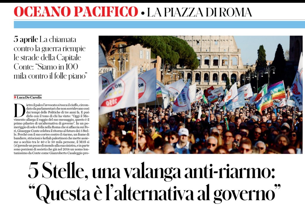 Dietro il palco l’avvocato si tocca il ciuffo, circondato da parlamentari che non sorridevano così dai tempi delle Politiche di tre anni fa. E può dirlo con il tono di chi ha vinto: “Oggi il Movimento allarga il raggio del suo messaggio, questo è il primo pilastro di un’alternativa di governo”. In un pomeriggio di sole e folla nella Roma che si affaccia sui Fori, Giuseppe Conte celebra il ritorno al futuro dei 5 Stelle. Perché con il suo corteo contro il riarmo, un fiume di bandiere, striscioni e kefiah palestinesi che mette assieme a occhio tra le 40 e le 50 mila persone, il M5S si (ri)prende un pezzo di mondo alla sua sinistra, e in parte sono porzioni di società che già nel 2014 un uomo lontanissimo da Conte come Gianroberto Casaleggio provò ad avvicinare al Movimento citando Enrico Berlinguer dal palco di piazza San Giovanni, come nume tutelare del M5S. Un’era geologica dopo, tanta sinistra radicale – o semplicemente delusa – marcia assieme ai 5 Stelle contiani, quelli “progressisti ma indipendenti”. Ed è valanga, inattesa anche per gli organizzatori, che alla vigilia puntavano alle 15 mila presenze. Invece sul palco in via dei Fori Imperiali Conte può esagerare: “Siamo in 100 mila”. Cifra chiaramente abnorme. Ma sono comunque decine di migliaia, i pacifisti. Così aprendo la manifestazione Paola Taverna può infierire dal microfono su Carlo Calenda: “Qualcuno voleva cancellare il M5S. Ebbene, cancellate questa piazza!”.