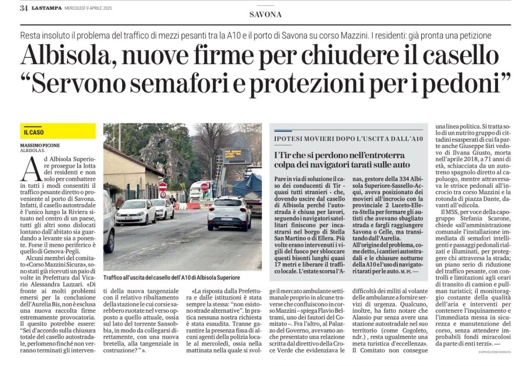 Ad Albisola Superiore prosegue la lotta dei residenti e non solo per combattere in tutti i modi consentiti il traffico pesante diretto o proveniente al porto di Savona. Infatti, il casello autostradale è l’unico lungo la Riviera situato nel centro di un paese, tutti gli altri sono dislocati lontano dall’abitato sia guardando a levante sia a ponente. Forse il meno periferico è quello di Genova-Pegli.