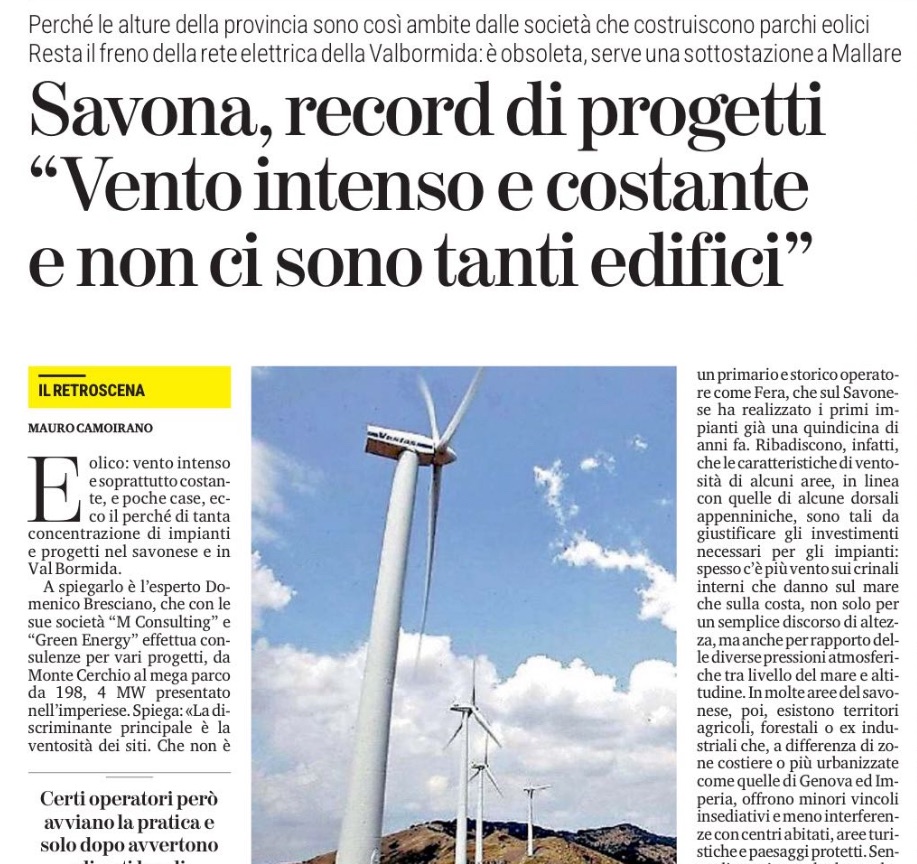 Stessa ottica, ma con qualche osservazione critica, da un primario e storico operatore come Fera, che sul Savonese ha realizzato i primi impianti già una quindicina di anni fa. Ribadiscono, infatti, che le caratteristiche di ventosità di alcuni aree, in linea con quelle di alcune dorsali appenniniche, sono tali da giustificare gli investimenti necessari per gli impianti: spesso c’è più vento sui crinali interni che danno sul mare che sulla costa, non solo per un semplice discorso di altezza, ma anche per rapporto delle diverse pressioni atmosferiche tra livello del mare e altitudine. In molte aree del savonese, poi, esistono territori agricoli, forestali o ex industriali che, a differenza di zone costiere o più urbanizzate come quelle di Genova ed Imperia, offrono minori vincoli insediativi e meno interferenze con centri abitati, aree turistiche e paesaggi protetti. Senza dimenticare che la produzione di energia rinnovabile in prossimità di complessi industriali, più frequenti in tali aree rispetto alla costa, risulta particolarmente idonea.