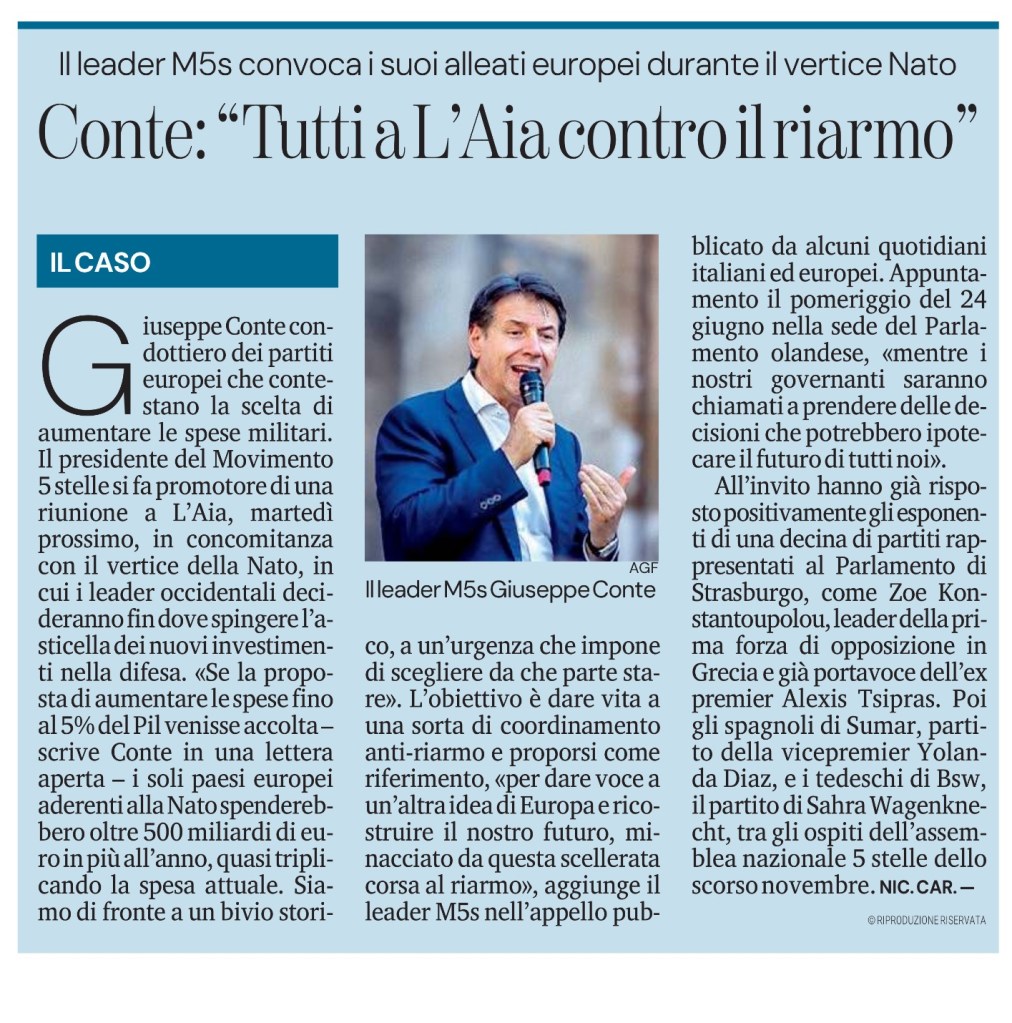 Giuseppe Conte condottiero dei partiti europei che contestano la scelta di aumentare le spese militari. Il presidente del Movimento 5 stelle si fa promotore di una riunione a L’Aia, martedì prossimo, in concomitanza con il vertice della Nato, in cui i leader occidentali decideranno fin dove spingere l’asticella dei nuovi investimenti nella difesa. «Se la proposta di aumentare le spese fino al 5% del Pil venisse accolta – scrive Conte in una lettera aperta – i soli paesi europei aderenti alla Nato spenderebbero oltre 500 miliardi di euro in più all’anno, quasi triplicando la spesa attuale. Siamo di fronte a un bivio storico, a un’urgenza che impone di scegliere da che parte stare». L’obiettivo è dare vita a una sorta di coordinamento anti-riarmo e proporsi come riferimento, «per dare voce a un’altra idea di Europa e ricostruire il nostro futuro, minacciato da questa scellerata corsa al riarmo», aggiunge il leader M5s nell’appello pubblicato da alcuni quotidiani italiani ed europei. Appuntamento il pomeriggio del 24 giugno nella sede del Parlamento olandese, «mentre i nostri governanti saranno chiamati a prendere delle decisioni che potrebbero ipotecare il futuro di tutti noi».