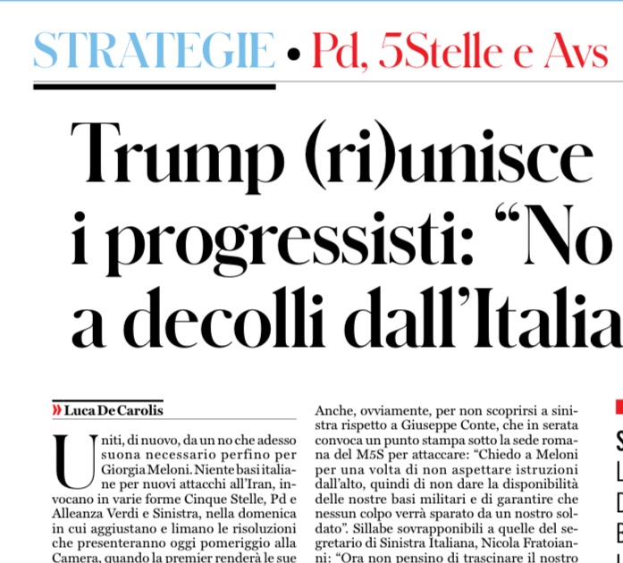 Concetto, raccontano, che avrebbe detto alla stessa Meloni nel corso di una telefonata. Nel pomeriggio sempre Schlein riunisce la segreteria del Pd in una conference call, per definire i contorni della risoluzione e la linea, anche comunicativa. È nella riunione che viene definito il punto sul no alle basi. Digerito, almeno per ora, anche dai riformisti del Pd. “Sperando che non si debba arrivare a quel punto” riflette a margine un big. Ma Schlein “sente” che non è più tempo di formule vaghe. Sa bene che il tema delle basi può diventare un fianco scoperto anche per Meloni, a sua volta conscia di quanto sia impopolare l’ennesima guerra. Tradotto, non è il momento per ritirare la gamba. Anche, ovviamente, per non scoprirsi a sinistra rispetto a Giuseppe Conte, che in serata convoca un punto stampa sotto la sede romana del M5S per attaccare: “Chiedo a Meloni per una volta di non aspettare istruzioni dall’alto, quindi di non dare la disponibilità delle nostre basi militari e di garantire che nessun colpo verrà sparato da un nostro soldato”. Sillabe sovrapponibili a quelle del segretario di Sinistra Italiana, Nicola Fratoianni: “Ora non pensino di trascinare il nostro Paese in guerra, concedendo l’uso di basi o del nostro spazio aereo”.