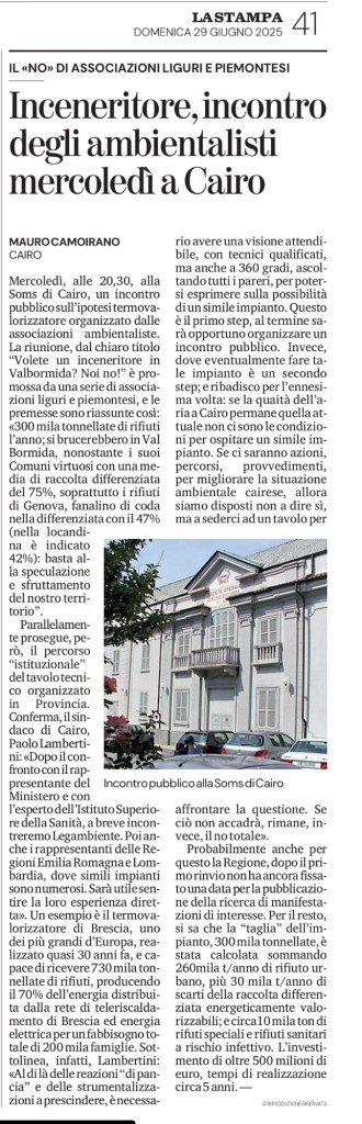 Mercoledì, alle 20,30, alla Soms di Cairo, un incontro pubblico sull’ipotesi termovalorizzatore organizzato dalle associazioni ambientaliste. La riunione, dal chiaro titolo “Volete un inceneritore in Valbormida? Noi no!” è promossa da una serie di associazioni liguri e piemontesi, e le premesse sono riassunte così: «300 mila tonnellate di rifiuti l’anno; si brucerebbero in Val Bormida, nonostante i suoi Comuni virtuosi con una media di raccolta differenziata del 75%, soprattutto i rifiuti di Genova, fanalino di coda nella differenziata con il 47% (nella locandina è indicato 42%): basta alla speculazione e sfruttamento del nostro territorio”.