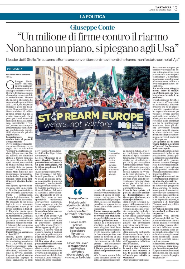 «La contrapposizione Welfare-sicurezza è nei fatti. Dove li prendiamo i soldi? O affami gli italiani oppure non rispetti gli impegni sottoscritti, confermando il luogo comune della solita Italietta inaffidabile. Le firme di Meloni, dal patto di stabilità al piano di riarmo, all’aumento al 5% in sede Nato, sono un irresponsabile tradimento dell’interesse nazionale. Senza neppure un voto democratico. O se lei preferisce: bieco populismo».