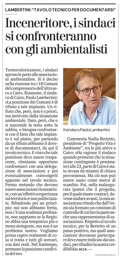 Termovalorizzatore, i sindaci aprono le porte alle associazioni ambientaliste. Si è deciso nella riunione tra i 18 Comuni del comprensorio dell’altra sera a Cairo. Riassume, il sindaco di Cairo, Paolo Lambertini: «La posizione dei Comuni è di rifiuto a tale impianto. Un rifiuto che, però, non è a priori, ma motivato dalla situazione ambientale. Dato, però, che o si nasconde la testa sotto la sabbia, o bisogna confrontarsi con il fatto che tale impianto è sul piatto, pur partendo da un rifiuto abbiamo il dovere di documentarci, da qui il tavolo tecnico. E visto che tale posizione deve essere trasparente, riteniamo opportuno confrontarci con una delegazione di associazioni e poi eventualmente coinvolgerli appunto nel tavolo tecnico. Fermo restando che devono essere associazioni riconosciute, con un’effettiva esperienza sul territorio e non politicizzate. Ribadendo poi un principio: noi non abbiamo fretta, non c’è una scadenza prefissata, non sappiamo se la Regione abbia una tempistica più o meno stringente, ma non è un problema nostro. Vogliamo prima capire realmente di cosa si tratta e tutti gli scenari, con dati reali. Nel frattempo, permane la posizione condivisa del no».