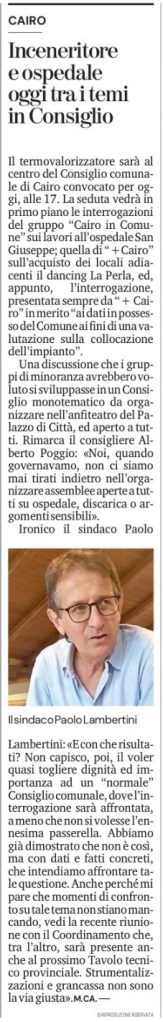 Il termovalorizzatore sarà al centro del Consiglio comunale di Cairo convocato per oggi, alle 17. La seduta vedrà in primo piano le interrogazioni del gruppo “Cairo in Comune” sui lavori all’ospedale San Giuseppe; quella di “+Cairo” sull’acquisto dei locali adiacenti il dancing La Perla, ed, appunto, l’interrogazione, presentata sempre da “+ Cairo” in merito “ai dati in possesso del Comune ai fini di una valutazione sulla collocazione dell’impianto”.