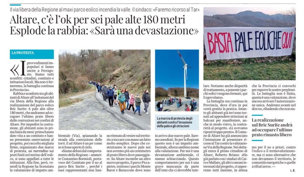 Rabbia e sconforto tra gli abitanti di Altare all’indomani del via libera della Regione alla realizzazione del parco eolico Bric Surite: 6 pale alte oltre 180 metri, che andranno ad occupare l’ultimo prato libero dalle costruzioni nei confini di Altare. Per impedire la costruzione, gli abitanti sono in prima linea da mesi: prima hanno dato vita a un comitato e hanno presentato osservazioni al progetto, poi raccolto migliaia firme, organizzato due marce di protesta, un merendino sui prati finiti nel mirino dell’eolico, si sono appellati a tutte le istituzioni. Alla fine, però, venerdì la Regione ha licenziato la valutazione di impatto ambientale (Via), spianando la strada alla costruzione delle torri. E ad Altare è un po’ come se si fosse aperto il cielo.