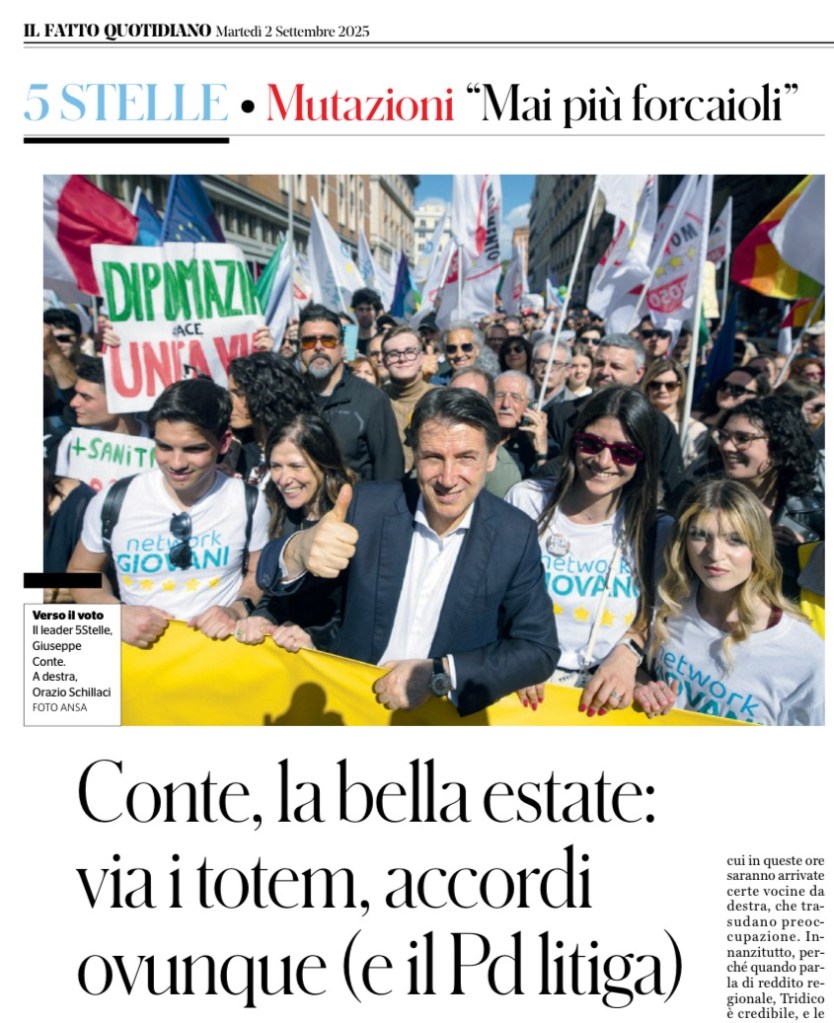 Decidano loro, sostiene l’avvocato che ha concesso ma pure imposto, politico con il bilancino che anni fa chiudeva arbitrati per tanti zeri e quindi sa quanto contino le pause come le virgole. C’è una foto che racconta già praticamente tutto: quella del 18 agosto, con la vicepresidente vicaria del Movimento Paola Taverna che firma l’accordo sul programma con il candidato del Pd in Toscana, il presidente uscente Eugenio Giani. Diversi attivisti 5Stelle – soprattutto toscani – si sono arrabbiati, molti militanti del Pd l’hanno presa peggio: e forse hanno ragione loro. “Una nostra dirigente accanto a un candidato che firma una carta tutte le nostre richieste, dal reddito di cittadinanza regionale alla chiusura del rigassificatore di Piombino: ma lei se lo sarebbe immaginato un risultato così anni fa? Abbiamo imposto l’agenda” sussurra un big. L’avvocato ci teneva, e non a caso ha voluto la fidatissima Taverna a quel tavolo. Proprio lui, che con un no a Matteo Ricci nelle Marche avrebbe devastato un campo politico ancora tutto da costruire, e non a caso mezzo Pd attendeva come un gol una sua scomunica per l’ex sindaco di Pesaro convocato in Procura. Invece Conte ha tenuto calmi innanzitutto i suoi, aspettando l’interrogatorio del candidato dem prima di calare il sì a Ricci, sostenuto fortissimamente da Goffredo Bettini, suo abituale confidente. “Non siamo forcaioli, mai più altre Bibbiano”, ha spiegato in quei giorni ai suoi, con sillabe che condannano il M5S che fu – quello di Luigi Di Maio, certo – e spalancano altre porte al nuovo Movimento contiano, anche per allargare la base eletorale.