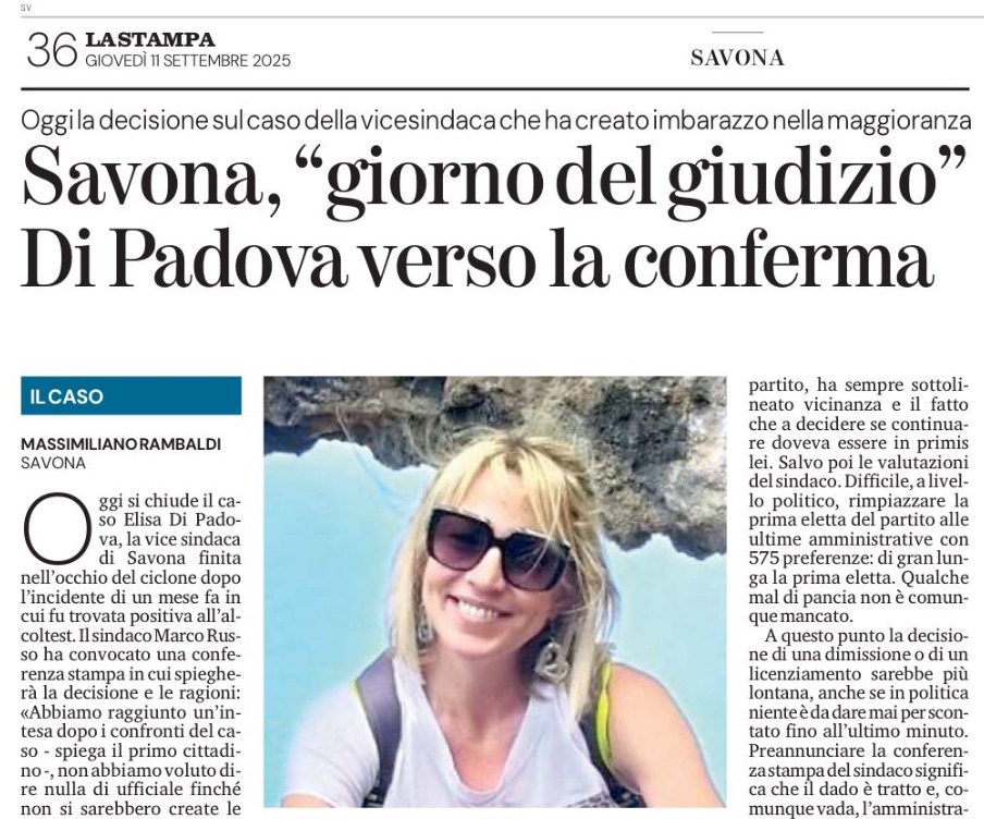 Oggi si chiude il caso Elisa Di Padova, la vice sindaca di Savona finita nell’occhio del ciclone dopo l’incidente di un mese fa in cui fu trovata positiva all’alcoltest. Il sindaco Marco Russo ha convocato una conferenza stampa in cui spiegherà la decisione e le ragioni: «Abbiamo raggiunto un’intesa dopo i confronti del caso – spiega il primo cittadino -, non abbiamo voluto dire nulla di ufficiale finché non si sarebbero create le condizioni per una posizione unitaria». Il riserbo resta massimo, ufficialmente, anche se tra i corridoi filtrano le varie ipotesi. Quella che va per la maggiore è la possibilità che Di Padova resti al suo posto, mettendo davanti la sua importanza e valenza amministrativa per il governo della città e derubricando il «fattaccio» come un errore – grave -, ma che non può cancellare il lavoro fatto fino a oggi. Se tale scenario verrà confermato domani dalle parole del sindaco verrebbe respinta al mittente anche la richiesta dei consiglieri di opposizione firmatari di una nota congiunta dove avevano chiesto le dimissioni della vice sindaca. Se Di Padova verrà confermata rimarrà l’intenzione della minoranza di non presentare una mozione di sfiducia? Si vedrà, nel frattempo si attendono gli eventi.