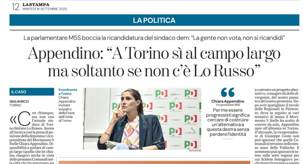 «Con chiunque, ma non con l’attuale sindaco di Torino Stefano Lo Russo». Suona all’incirca così la presa di posizione della deputata e vicepresidente del Movimento 5 Stelle Chiara Appendino. Disponibilità a parlare di campo largo (quello che lei chiama «lungo») anche in vista delle prossime Comunali nella città che ha governato tra il 2016 e il 2021. Ma solamente se il nome del candidato non sarà quello del primo cittadino uscente e vicepresidente dell’Anci.