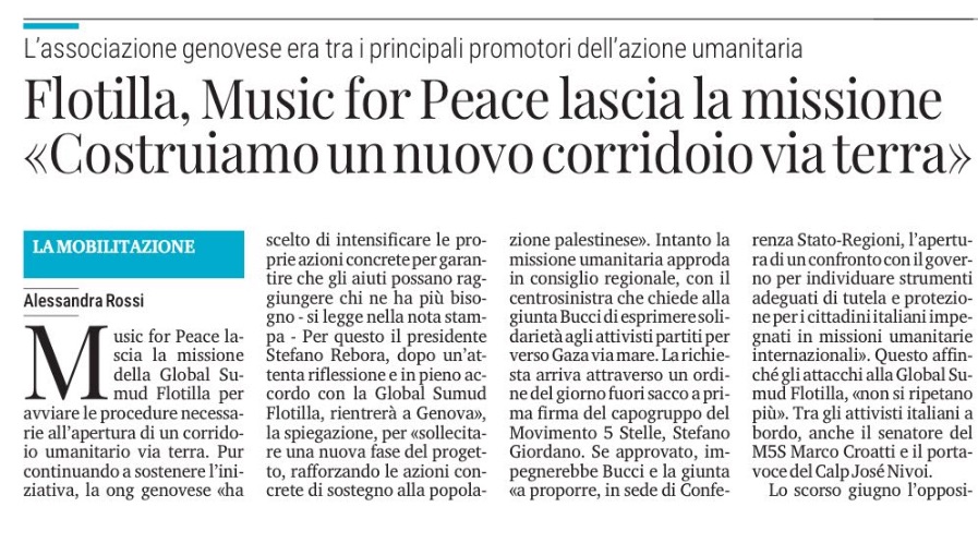 Music for Peace lascia la missione della Global Sumud Flotilla per avviare le procedure necessarie all’apertura di un corridoio umanitario via terra. Pur continuando a sostenere l’iniziativa, la ong genovese «ha scelto di intensificare le proprie azioni concrete per garantire che gli aiuti possano raggiungere chi ne ha più bisogno – si legge nella nota stampa – Per questo il presidente Stefano Rebora, dopo un’attenta riflessione e in pieno accordo con la Global Sumud Flotilla, rientrerà a Genova», la spiegazione, per «sollecitare una nuova fase del progetto, rafforzando le azioni concrete di sostegno alla popolazione palestinese». Intanto la missione umanitaria approda in consiglio regionale, con il centrosinistra che chiede alla giunta Bucci di esprimere solidarietà agli attivisti partiti per verso Gaza via mare. La richiesta arriva attraverso un ordine del giorno fuori sacco a prima firma del capogruppo del Movimento 5 Stelle, Stefano Giordano. Se approvato, impegnerebbe Bucci e la giunta «a proporre, in sede di Conferenza Stato-Regioni, l’apertura di un confronto con il governo per individuare strumenti adeguati di tutela e protezione per i cittadini italiani impegnati in missioni umanitarie internazionali». Questo affinché gli attacchi alla Global Sumud Flotilla, «non si ripetano più». Tra gli attivisti italiani a bordo, anche il senatore del M5S Marco Croatti e il portavoce del Calp José Nivoi.