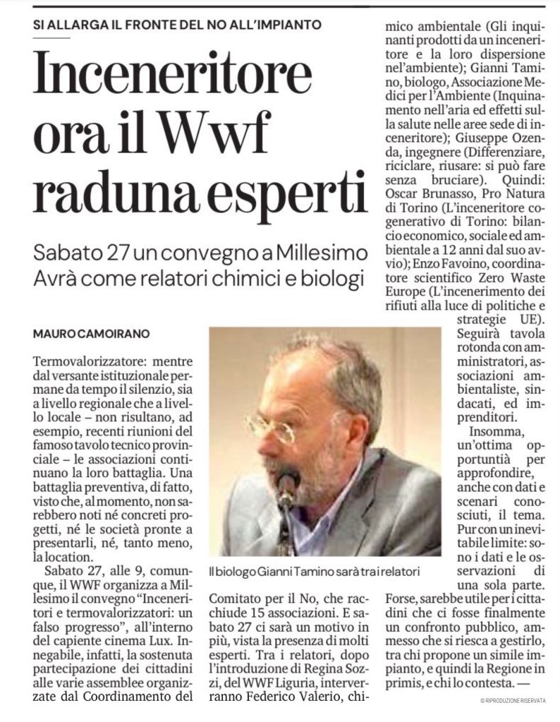 Sabato 27, alle 9, comunque, il WWF organizza a Millesimo il convegno “Inceneritori e termovalorizzatori: un falso progresso”, all’interno del capiente cinema Lux. Innegabile, infatti, la sostenuta partecipazione dei cittadini alle varie assemblee organizzate dal Coordinamento del Comitato per il No, che racchiude 15 associazioni. E sabato 27 ci sarà un motivo in più, vista la presenza di molti esperti. Tra i relatori, dopo l’introduzione di Regina Sozzi, del WWF Liguria, interverranno Federico Valerio, chimico ambientale (Gli inquinanti prodotti da un inceneritore e la loro dispersione nel’ambiente); Gianni Tamino, biologo, Associazione Medici per l’Ambiente (Inquinamento nell’aria ed effetti sulla salute nelle aree sede di inceneritore); Giuseppe Ozenda, ingegnere (Differenziare, riciclare, riusare: si può fare senza bruciare). Quindi: Oscar Brunasso, Pro Natura di Torino (L’inceneritore cogenerativo di Torino: bilancio economico, sociale ed ambientale a 12 anni dal suo avvio); Enzo Favoino, coordinatore scientifico Zero Waste Europe (L’incenerimento dei rifiuti alla luce di politiche e strategie UE). Seguirà tavola rotonda con amministratori, associazioni ambientaliste, sindacati, ed imprenditori.