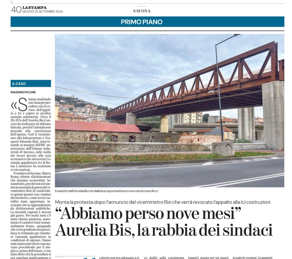«Stiamo studiando con Anas per procedere con la revoca dell’appalto a Ici e capire se un’altra azienda subentrerà. Circa il 20-25% dell’Aurelia Bis è ancora da realizzare ed abbiano faticato, perché l’azienda non procede alla conclusione dell’opera». Così il viceministro alle Infrastrutture e Trasporti Edoardo Rixi, intervenendo ai margini dell’80° anniversario dell’Unione Industriali di Savona, sullo stallo dei lavori dovuto alla crisi economica che attraversa l’azienda appaltatrice Ici di Roma L’annuncio ha scatenato ovvie reazioni.