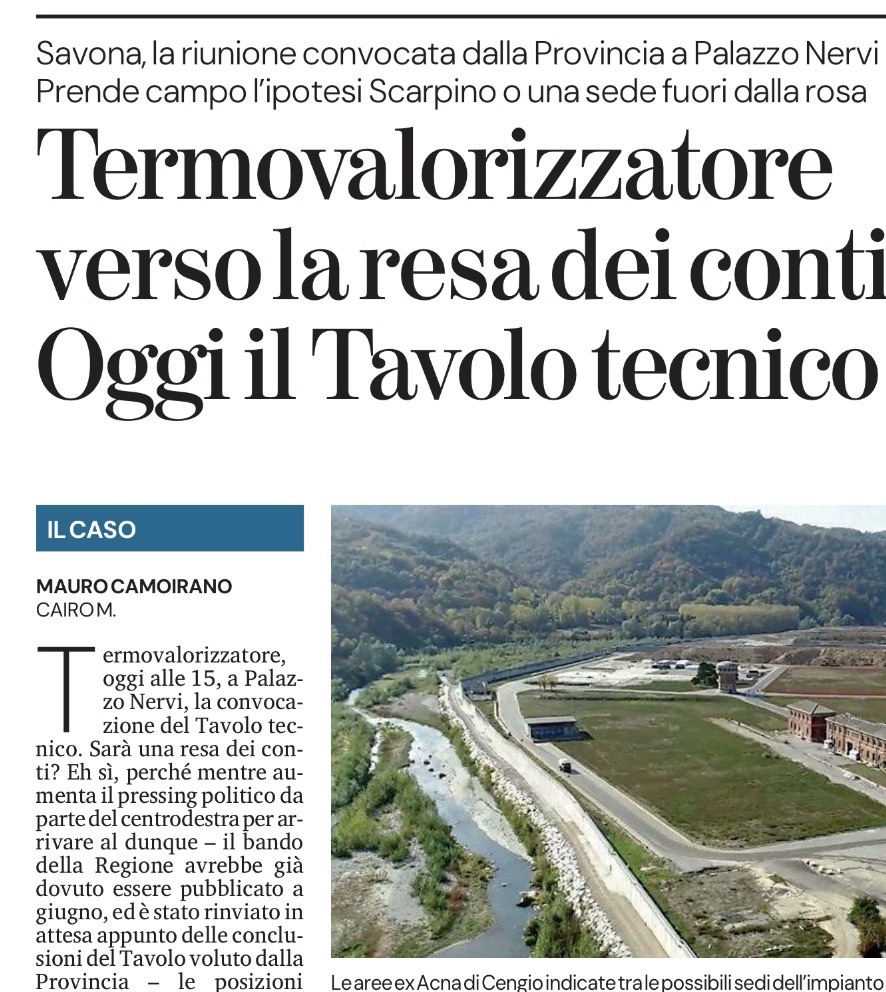 Ma proprio nel Tavolo la temperatura si sta alzando. Il presidente della Provincia, Pierangelo Olivieri, ha dichiarato che «l’unica strada percorribile è la realizzazione di impianti altamente performanti, capaci di trasformare i rifiuti in energia green». Una posizione come presidente della Provincia, che, però, è sembrata essere la conclusione del Tavolo, tanto che il sindaco di Carcare, Rodolfo Mirri, che ne fa parte, ne ha subito preso le distanze. Così come non è mutata la posizione del sindaco di Cairo, Paolo Lambertini: «Con l’attuale situazione ambientale, Cairo non è disponibile ad ospitare né un termovalorizzatore, né altri impianti chimici». Insomma, se il Tavolo aveva come obiettivo di tirare le somme ed arrivare ad una posizione condivisa, finora pare abbia fallito. Oggi la risposta.