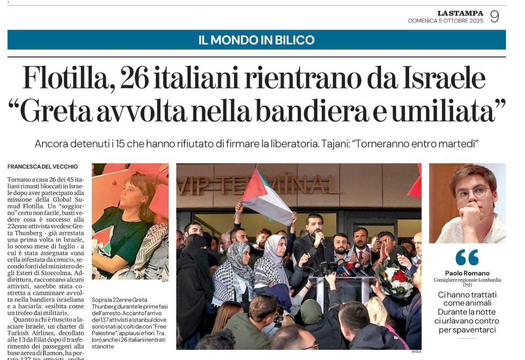 Tornano a casa 26 dei 45 italiani rimasti bloccati in Israele dopo aver partecipato alla missione della Global Sumud Flotilla. Un “soggiorno” certo non facile, basti vedere cosa è successo alla 22enne attivista svedese Greta Thunberg – già arrestata una prima volta in Israele, lo scorso mese di luglio – a cui è stata assegnata «una cella infestata da cimici», secondo fonti del ministero degli Esteri di Stoccolma. Addirittura, raccontano alcuni attivisti, sarebbe stata costretta a camminare avvolta nella bandiera israeliana e a baciarla: «esibita come un trofeo dai militari».