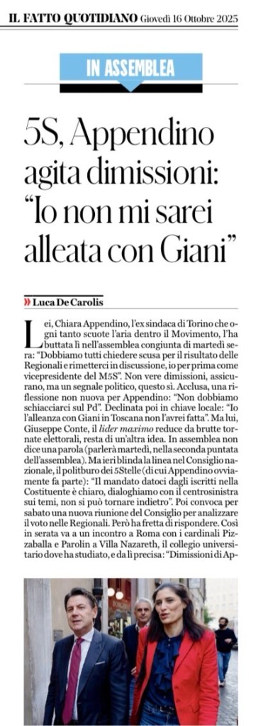 Lei, Chiara Appendino, l’ex sindaca di Torino che ogni tanto scuote l’aria dentro il Movimento, l’ha buttata lì nell’assemblea congiunta di martedì sera: “Dobbiamo tutti chiedere scusa per il risultato delle Regionali e rimetterci in discussione, io per prima come vicepresidente del M5S”. Non vere dimissioni, assicurano, ma un segnale politico, questo sì. Acclusa, una riflessione non nuova per Appendino: “Non dobbiamo schiacciarci sul Pd”. Declinata poi in chiave locale: “Io l’alleanza con Giani in Toscana non l’avrei fatta”. Ma lui, Giuseppe Conte, il lider maximo reduce da brutte tornate elettorali, resta di un’altra idea. In assemblea non dice una parola (parlerà martedì, nella seconda puntata dell’assemblea). Ma ieri blinda la linea nel Consiglio nazionale, il politburo dei 5Stelle (di cui Appendino ovviamente fa parte): “Il mandato datoci dagli iscritti nella Costituente è chiaro, dialoghiamo con il centrosinistra sui temi, non si può tornare indietro”. Poi convoca per sabato una nuova riunione del Consiglio per analizzare il voto nelle Regionali. Però ha fretta di rispondere. Così in serata va a un incontro a Roma con i cardinali Pizzaballa e Parolin a Villa Nazareth, il collegio universitario dove ha studiato, e da lì precisa: “Dimissioni di Appendino? Io non ho ricevuto nulla, non ne vedrei il motivo. E poi non avrebbe senso, a breve si rinnova la mia carica di presidente e vanno a scadenza anche i vice”. Come a dire che si parla del nulla. Quindi, lo ripete in chiaro: “Non siamo schiacciati sul Pd, il Movimento è una forza progressista indipendente come deciso dagli iscritti. Ci si allea solo se ci sono programmi chiari, concordati per iscritto e condivisi”.