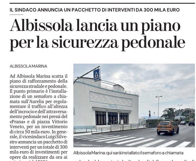 Ad Albissola Marina scatta il piano di rafforzamento della sicurezza stradale e pedonale. Il punto primario è l’installazione di un semaforo a chiamata sull’Aurelia per regolamentare il traffico all’altezza dell’incrocio e dell’attraversamento pedonale nei pressi del «Prana» e di piazza Vittorio Veneto, per un investimento di circa 50 mila euro. In generale, il vicesindaco Luigi Silvestro annuncia un pacchetto di interventi per un totale di 300 mila euro di investimenti per opere da realizzare da ora ai primi mesi del 2026.