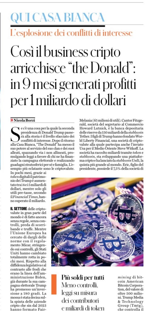 Se c’è una cosa per la quale la seconda presidenza di Donald Trump passerà alla storia è il livello sfacciato dei conflitti di interesse. Dopo il ritorno alla Casa Bianca, “The Donald” ha messo il suo potere al servizio del suo clan e dei suoi alleati, spazzando via i non allineati, promulgando leggi a favore di chi ne ha finanziato la campagna elettorale e realizzando guadagni stratosferici per sé e famiglia. L’esempio più eclatante sono le criptovalute. In pochi mesi, grazie ai token digitali il patrimonio dei Trump è aumentato tra i 4 e i 5 miliardi di dollari, mentre solo gli utili pre-tasse, secondo il Financial Times, hanno superato il miliardo.