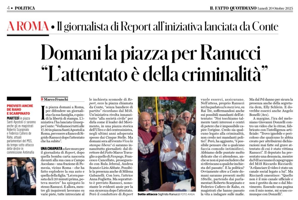 In piazza domani a Roma, per difendere un giornalista e la sua famiglia, e quindi la libertà di stampa. L’iniziativa l’ha lanciata Giuseppe Conte: “Vediamoci tutti alle 17.30 in piazza Santi Apostoli a Roma, per essere a fianco di Sigrido Ranucci dopo l’attentato che ha subito”.