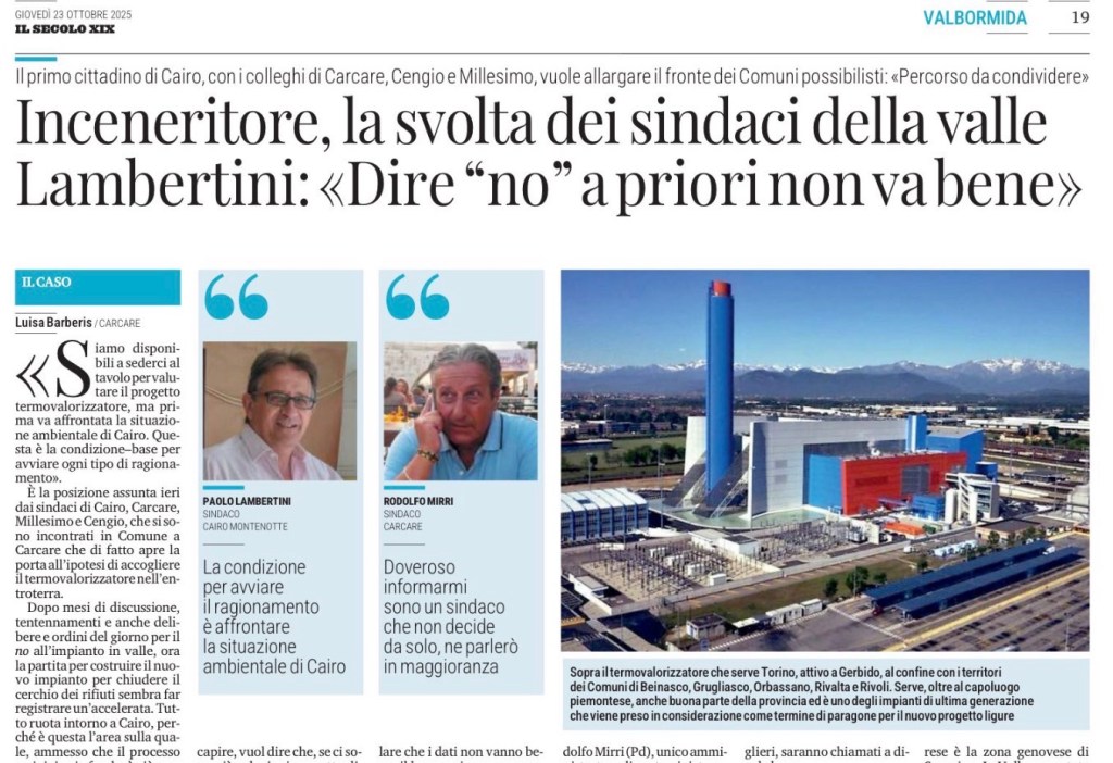 È la posizione assunta ieri dai sindaci di Cairo, Carcare, Millesimo e Cengio, che si sono incontrati in Comune a Carcare che di fatto apre la porta all’ipotesi di accogliere il termovalorizzatore nell’entroterra.