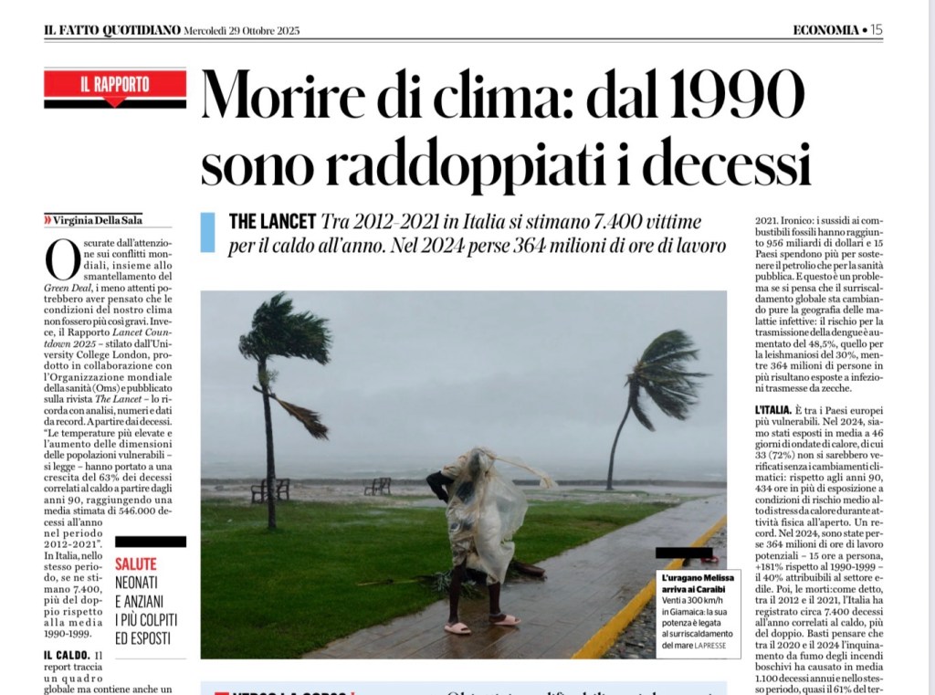 Oscurate dall’attenzione sui conflitti mondiali, insieme allo smantellamento del Green Deal, i meno attenti potrebbero aver pensato che le condizioni del nostro clima non fossero più così gravi. Invece, il Rapporto Lancet Countdown 2025 – stilato dall’University College London, prodotto in collaborazione con l’Organizzazione mondiale della sanità (Oms) e pubblicato sulla rivista The Lancet – lo ricorda con analisi, numeri e dati da record. A partire dai decessi. “Le temperature più elevate e l’aumento delle dimensioni delle popolazioni vulnerabili – si legge – hanno portato a una crescita del 63% dei decessi correlati al caldo a partire dagli anni 90, raggiungendo una media stimata di 546.000 decessi all’anno nel periodo 2012-2021”. In Italia, nello stesso periodo, se ne stimano 7.400, più del doppio rispetto alla media 1990-1999.