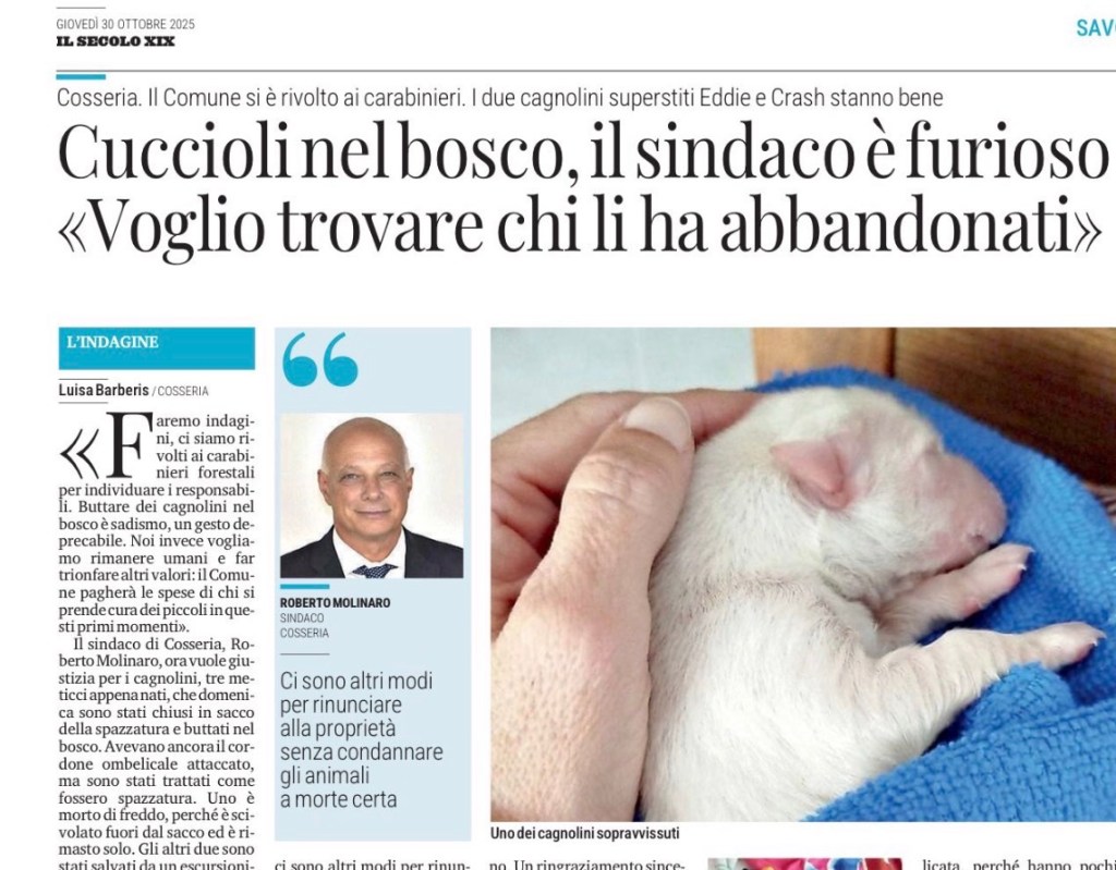 Il sindaco di Cosseria, Roberto Molinaro, ora vuole giustizia per i cagnolini, tre meticci appena nati, che domenica sono stati chiusi in sacco della spazzatura e buttati nel bosco. Avevano ancora il cordone ombelicale attaccato, ma sono stati trattati come fossero spazzatura. Uno è morto di freddo, perché è scivolato fuori dal sacco ed è rimasto solo. Gli altri due sono stati salvati da un escursionista.