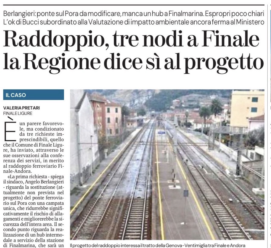«La prima richiesta – spiega il sindaco, Angelo Berlangieri – riguarda la sostituzione (attualmente non prevista nel progetto) del ponte ferroviario sul Pora con una campata unica, che ridurrebbe significativamente il rischio di allagamenti e migliorerebbe la sicurezza dell’intera area. Il secondo punto riguarda la realizzazione di un hub intermodale a servizio della stazione di Finalmarina, che sarà un punto importante del medio ponente, tra Savona e Albenga. Secondo uno studio realizzato dai nostri uffici comunali, considerando una stima prudenziale si passerà dagli attuali 6 mila utenti a 11.500. Serviranno quindi almeno 250 posti auto, un terminal autobus, 200 postazioni per bici e stalli per taxi. Il progetto attuale che prevede espropri nella zona intorno alla stazione di Finalmarina non sarebbe sufficiente a soddisfare questi fabbisogni. Infine abbiamo chiesto a Rfi un dossier chiaro sugli espropri relativi non solo ai terreni, ma soprattutto ai fabbricati, perché la documentazione non è completa».