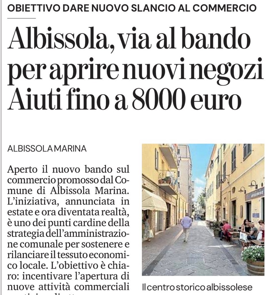 Aperto il nuovo bando sul commercio promosso dal Comune di Albissola Marina. L’iniziativa, annunciata in estate e ora diventata realtà, è uno dei punti cardine della strategia dell’amministrazione comunale per sostenere e rilanciare il tessuto economico locale. L’obiettivo è chiaro: incentivare l’apertura di nuove attività commerciali e artigianali attraverso contributi a fondo perduto, fino a un massimo di 8.000 euro per ogni progetto ammesso.