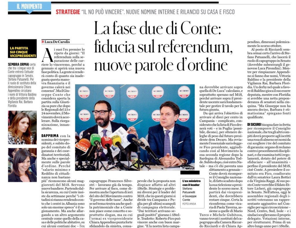 Ai suoi l’ex premier lo ripete da giorni: “Il referendum sulla separazione delle carriere lo vinceremo, perché a gennaio si aprirà una nuova fase politica. La gente si renderà conto di quanto sia inadeguata questa manovra finanziaria e il governo calerà nei consensi”. Ma il Giuseppe Conte che considera aperta la partita sulla Giustizia sa pure che dopo le Regionali del 23 e 24 novembre, il Movimento dovrà accelerare. Sulla riorganizzazione, innanzitutto.